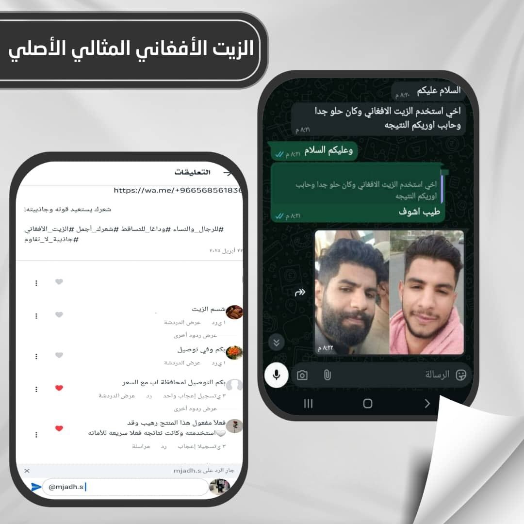 جربت عدة منتجات من قبل ولم أحصل على نتيجة، لكن مع الزيت الأفغاني المثالي لاحظت فرق حقيقي: الشعر أصبح أقوى، التساقط قل بشكل كبير، والفراغات بدأت تتحسن
